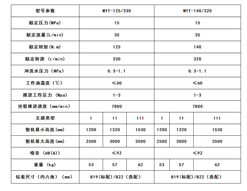 根據(jù)礦上巷道的高低我們有不同高度的鉆機,分為123型 ,根據(jù)礦.上的習(xí)慣不同有MYT-125/330型和MT-140/320型等。鉆具可根據(jù)礦上鉆桿情況配用B22或B19鉆套。